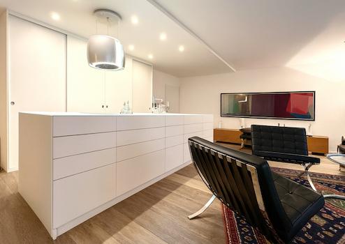 Die maßgefertigte Einbauküche ist ein weiteres Highlight: Ausgestattet mit hochwertigen Miele-Geräten (Aurora DA-Haube, Backofen, Induktionskochfeld, Kühlschrank, Geschirrspüler, Müllzerhacker), einem zusätzlichen Gefrierschrank sowie einem zentralen Küchenblock mit 24 Schubladen und durchgehender Glasarbeitsplatte bietet sie höchsten Komfort und viel Stauraum.