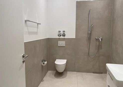 Das Badezimmer ist mit großformatigen hochwertigen Fliesen ausgelegt und verfügt über eine stufenlose Dusche (Waschmaschinenanschluss)