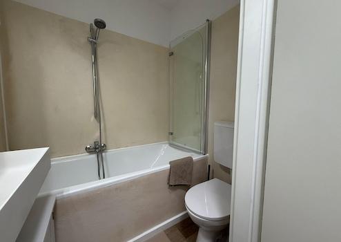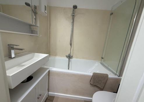 Moderne Fliesen im Bad, Laminatboden im Wohnraum