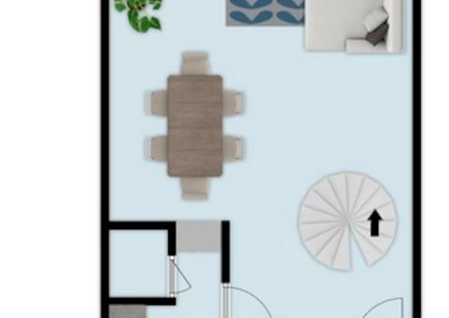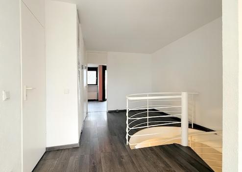 Beim Betreten der hellen Wohnung mit Blick ins Grüne empfängt Sie ein praktischer Eingangsbereich, welcher sich in den großzügigen Wohnraum öffnet. Von hier aus gelangen Sie durch eine kleine Garderobe in das Gäste-WC sowie auf direktem Wege in die Küche. Der gut geschnittene Wohnraum bietet die Möglichkeit einen Wohn- und einen Essbereich einzurichten. Ein Balkon mit Südausrichtung rundet die Ebene ab. Über eine offene Wendeltreppe gelangen Sie in die obere Ebene. Hier befinden sich das Schlafzimmer, ein großer offener Raum, welcher mit wenig Aufwand abgetrennt werden kann, das Wannenbad und ein WC. Beide Räume verfügen über jeweils einen eigenen Balkon.
