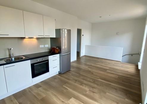 Die Wohnung ist teilmöbliert. Der offene Wohn- und Küchenbereich ist hochwertig und stilvoll in beigen Farbtönen eingerichtet und verfügt über eine moderne Einbauküche (EBK).