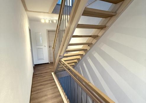 Die Wohnung befindet sich im Obergeschoss und Dachgeschoss eines einladenden Zweifamilienhauses und wurde umfassend saniert – inklusive Dach, Wände, Türen, Elektrik, Heizung und Sanitärinstallationen. Dank einer Dämmung nach aktuellem Neubau-Standard erwarten Sie energieeffizientes Wohnen und ein angenehmes Raumklima zu jeder Jahreszeit.