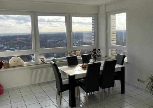 Der großzügige Wohn- und Essbereich ist durch die große Fensterfront sehr lichtdurchflutet und bietet einen freien Panoramablick. Der angrenzende Balkon lädt zum Verweilen ein.