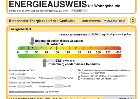 Dank neuer Dämmung, Photovoltaikanlage mit Speicher und zwei Luftwasser-Wärmepumpen erfüllt das Haus höchste Ansprüche an Nachhaltigkeit. Das Anwesen wurde in den letzten Jahren umfassend saniert und präsentiert sich heute in einem neuwertigen Zustand mit außergewöhnlich gehobenem Wohnkomfort. Das Gebäude erfüllt die Energieklasse "A" mit einem Energiebedarf des Gebäudes 39 kWh/(m²*a). Der Energieausweis wurde im Januar 2026 ausgestellt.