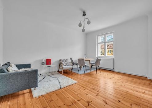 Die sanierte Wohnung verfügt über eine moderne Ausstattung, die zeitgemäßen Ansprüchen gerecht wird. Die Altbauästhetik wurde geschickt mit zeitgemäßen Elementen kombiniert, um ein harmonisches Wohnambiente zu schaffen.