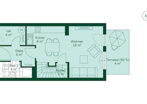 - Offener, lichtdurchfluteter Wohnbereich im Erdgeschoss mit direktem Zugang zur Terrasse – perfekt zum Entspannen und Genießen.