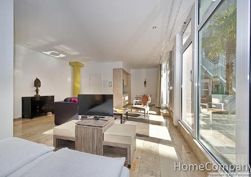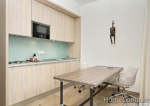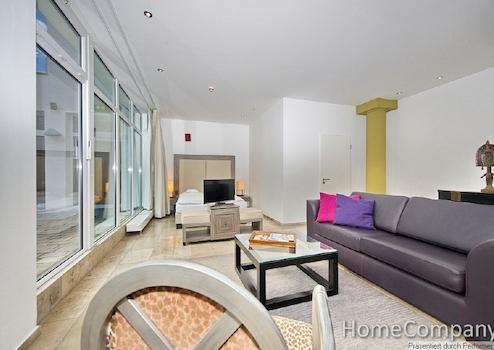 Dieses außergewöhnliche Apartment bietet mediterranes Flair dank der palmenbepflanzten Terrasse im Innenhof. Ein Glas Wein im Freien während der warmen Jahreszeit bietet Ihnen Entspannung nach Ihrer Projektarbeit. Dank der großen Glasfront ist das Apartment besonders hell und freundlich. Der offene Schnitt, der einen Blick vom Wohnbereich in den Schlafbereich erlaubt, bietet Ihnen viel Raum zum Wohnen. Das separierte, geräumige Bad ist mit einer ebenerdigen Dusche ausgestattet. Die gesamten Bodenflächen und das Bad sind mit exklusiven Natursteinfliesen versehen, ideal für Allergiker. Die hochwertige Einbauküche ist mit Spülmaschine, Kühlschrank, Mikrowelle mit Grillfunktion und einer Koch Zone mit 4 Kochplatten ausgestattet. Selbstverständlich finden Sie auch eine Grundausstattung an Geschirr und Kochutensilien vor. Der begehbare Kleiderschrank bietet viel Platz für Ihre persönlichen Dinge und verfügt auch über ein Schließfach. Die Miete beträgt 1550 € inklusive aller Nebenkosten, Energie und der Nutzung des Internetzugang. Wenn verfügbar kann ein Tiefgaragenstellplatz im Haus für monatlich 100 € angemietet werden. Wenn gewünscht ist auch ein regelmäßiger Reinigungsservice möglich, die Berechnung erfolgt nach Aufwand. Waschmaschine und ein Trockner stehen Ihnen zur Mitbenutzung im Keller zur Verfügung. Die Endreinigung obliegt dem Vermieter, erfolgt nach Aufwand und wird mit 35 € pro Stunde abgerechnet.