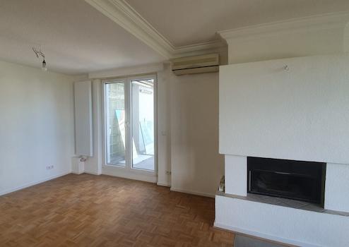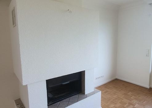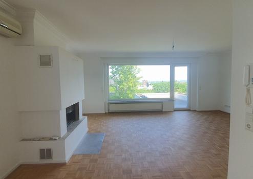 Weiter durch den Flur gelangen Sie in das lichtdurchflutete Wohn- und Esszimmer. Der Blick durch das riesige Fenster reicht bei klarer Sicht bis zum Odenwald. Abends genießt man diesen Blick vor dem Kamin mit einem leckeren Getränk. Während der Sommermonate können Sie wahlweise eine der Terrassen nutzen.