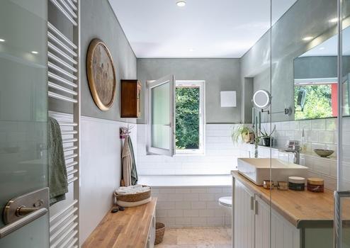 Hauptwohnung (185 m²): lichtdurchflutete Räume mit großen Fensterfronten und zwei Decken-Oberlichtern. Neu gestaltetes Bad im Retro-Design mit Badewanne und bodengleicher Dusche. Ganzjährig nutzbarer, beheizter Wintergarten mit Ausblick ins Grüne.