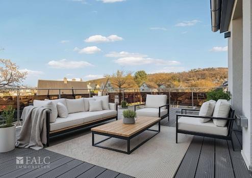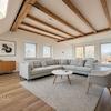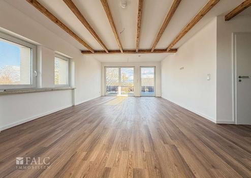 Die obere Ebene bildet den zentralen Wohnbereich der Wohnung. Hier befindet sich der großzügige Wohnraum mit circa 39 m², der durch offen gelegte Holzbalken einen besonderen architektonischen Charakter und ein stilvolles Wohnambiente erhält. Der Wohnbereich bietet einen direkten Zugang zur großzügigen Terrasse mit einer Fläche von circa 27 m², von der aus sich ein herrlicher Blick auf den angrenzenden Wald eröffnet. Diese Außenfläche stellt eine besondere Qualität dar und erweitert den Wohnraum ideal ins Freie. Ebenfalls auf dieser Ebene befinden sich die Küche sowie ein modernes Tageslichtbad mit Dusche.