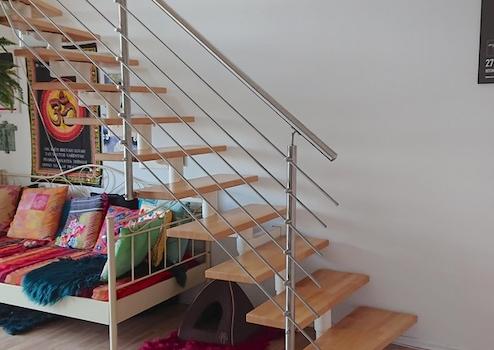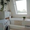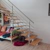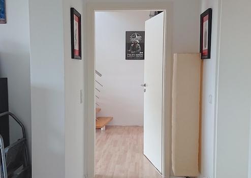Die untere Etage teilt sich auf in den Wohnungsflur, von dem aus man das erste Badezimmer mit Badewanne, das Schlafzimmer, sowie die Küche mit dem Blick auf das Dortmunder U und ein vielseitig nutzbares Durchgangszimmer mit dem Treppenaufgang erreicht. Sowohl von der Küche als auch vom Durchgangszimmer gelangt man auf einen von zwei Balkonen, der im Sommer mit einem Blick in grüne Baumkronen und seinem gemütlichen loggiaartigen Schnitt besticht.