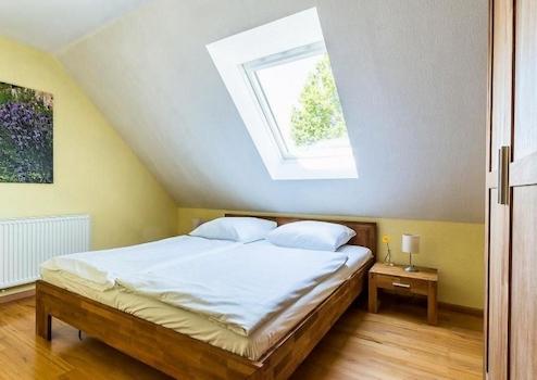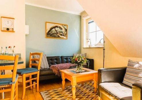 Die Dachgeschoss Wohnung liegt links von der Maisonette Wohnung im Obergeschoss und ist über eine großzügige Außentreppe erreichbar. Sie ist ca. 38 m² groß und verfügt über ein großes Wohnzimmer mit offener Küche, ein großes und gemütliches Schlafzimmer mit Mühlenblick sowie ein Duschbad mit Tageslicht. Das Highlight dieser durch ihre Schrägen sehr gemütlich anmutenden Wohnung ist der schöne Boddenblick mit Sonnenaufgang und ihre Terrasse im Außenbereich am Fuß der Zugangstreppe.