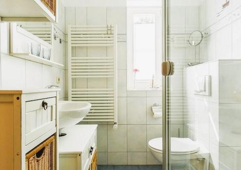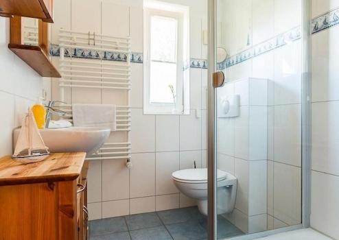 Als Rückzugsorte hat jede der drei Wohnungen ein separates Tageslichtbad in modern maritimer Ausstattung. Die Maisonette Wohnung besticht durch ihre große familientaugliche Eckbadewanne und dem unverbaubaren Boddenblick aus dem Obergeschoss.