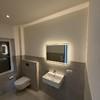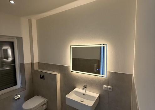 Für Besucher steht zusätzlich ein separates Gäste-WC zur Verfügung. Dieses ist mit einem Waschbecken inklusive Badmöbel, einer hochwertigen Verfliesung sowie einer integrierten Beleuchtung ausgestattet.