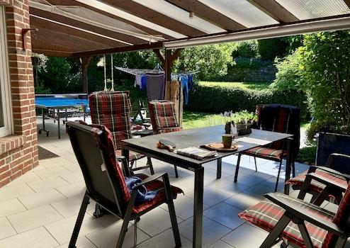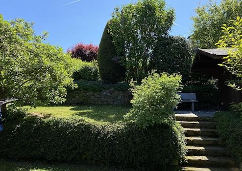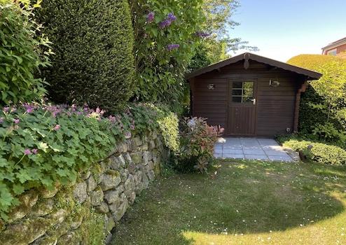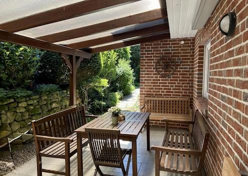 Zwei überdachte Terrassen sowie ein pflegeleichter Garten mit Natursteinmauern schaffen ein angenehmes Umfeld bei geringem Pflegeaufwand.