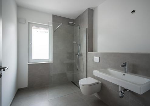 Die Bäder sind modern gestaltet mit bodentiefer Regendusche, großformatigen Fliesen aus Feinsteinzeug und Markeneinbauten.
