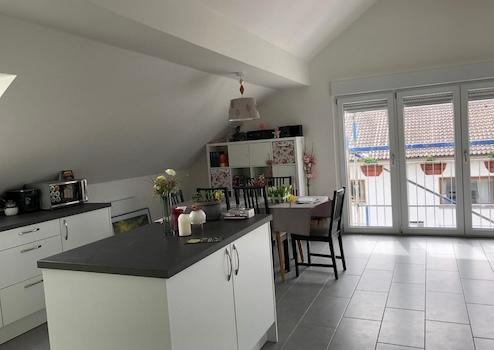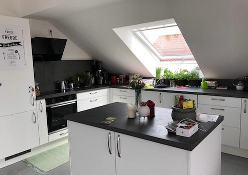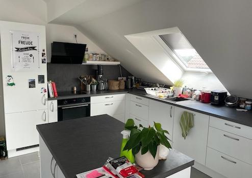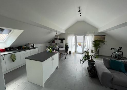 Eine moderne großzügig gestaltete und mit allen Geräten ausgestattete Einbauküche komplettiert den offenen Wohn-Essbereich. Durch bodentiefe Fenster, die mit elektrischen Rolläden ausgestattet sind, dem hellen Fliesenbelag und den teilweise Dachschrägen ergibt sich ein angenehmes, modernes und doch gemütliches Wohnambiente