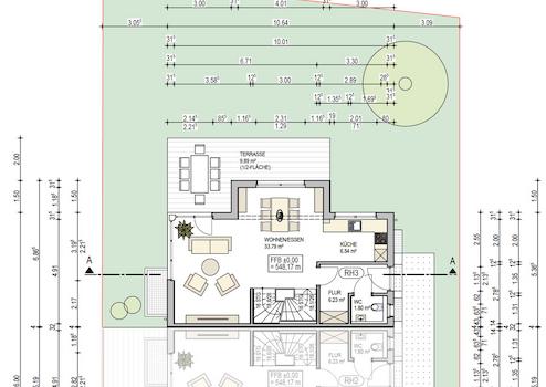 - Wohnbereich: Offener Wohn- und Essbereich mit direktem Terrassenzugang
