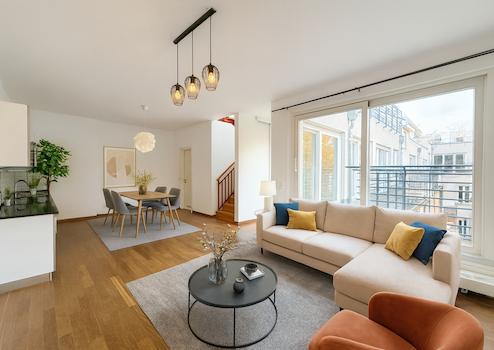 Dieses außergewöhnliche Maisonette-Penthouse krönt ein liebevoll restauriertes historisches Gebäude und vereint den Charme klassischer Architektur mit dem Komfort moderner Renovierungen. Auf den oberen Etagen gelegen, empfängt Sie die Hauptebene der Wohnung mit einem großzügigen, lichtdurchfluteten Wohnbereich und einer beeindruckenden offenen Küche – ideal für entspanntes Wohnen im Alltag oder stilvolles Unterhalten. Zwei gemütliche Schlafzimmer bieten Flexibilität für Familien, Gäste oder ein separates Arbeitszimmer. Das Hauptschlafzimmer verfügt über ein eigenes en-suite Badezimmer, während ein separates Gäste-Badezimmer zusätzlichen Komfort bietet. Bodentiefe Türen öffnen sich zu einer großen privaten Terrasse, die den Wohnbereich nach außen erweitert.