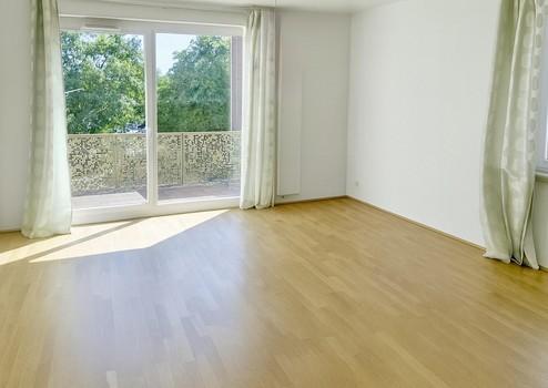 Das lichtdurchflutete, ca. 30 m² große Wohnzimmer mit bodentiefen Fenstern lädt zum Kochen, Entspannen und Zusammensein ein. Die Wohnung mit zwei Zimmern, hochwertigem Parkettboden, einem modernen Bad mit Dusche und einem praktischen Abstellraum schafft eine elegante Atmosphäre. Der freie Ausblick ins Grüne rundet den Zauber ab. Die Beheizung erfolgt per effizienter Fernwärme.