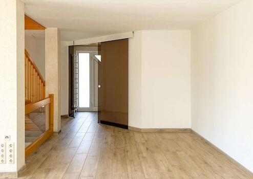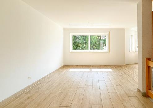 Bereits der einladende Eingangsbereich schafft eine freundliche Atmosphäre. Linker Hand befindet sich eine Garderobe mit ausreichend Platz, angrenzend ein praktisches Gäste-Bad. Eine elegante Glasschiebetür trennt die Diele vom großzügigen, offenen Wohn- und Essbereich. Das Wohnzimmer ist hell, geräumig und verfügt über einen charmanten Erkerbereich. Die moderne, offene Küche fügt sich harmonisch ein und bietet, ebenso wie der Wohnbereich, Zugang zur sonnigen Süd-Terrasse. Jalousien sorgen für eine angenehme Verschattung des Hauses. Das Highlight des Hauses ist die massive, maßangefertigte Holztreppe, die das Zentrum des Hauses bildet und ins Obergeschoss führt.