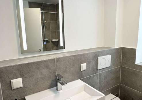 Das kleine aber feine Badezimmer besticht durch seine gute Raumaufteilung und eine Hans Grohe Regendusche.