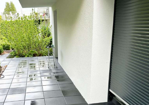 Das geräumige Wohnzimmer mit direktem Zugang zur großen Terrasse (telweise überdacht) zum Verweilen und Entspannen ein. Durch die bodentiefen Fenster haben Sie einen herrlichen Blick ins Grüne.