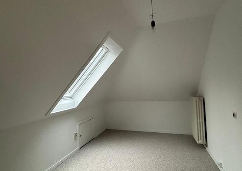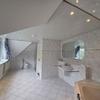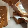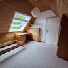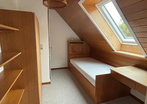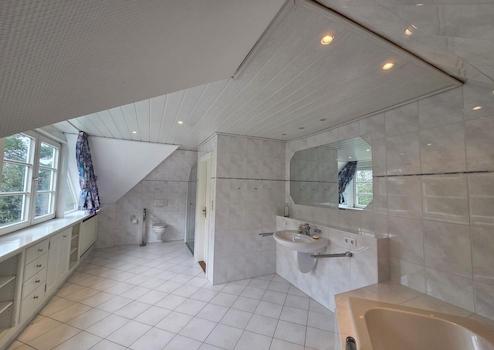 Das Obergeschoss ist aufgeteilt in ein großes barrierefreies Vollbad, drei kleinere Dachschrägräume, die z. B. als Kinderzimmer genutzt werden können, sowie ein großes Zimmer mit Holzfußboden, zu dem ein Balkon gehört.