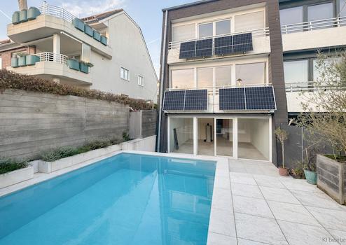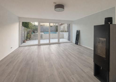 Im Gartengeschoss liegt der zweite Wohnraum mit Zugang zur Terrasse und dem geschützten Außenbereich mit beheizbarem Pool – ein Ort zum Entspannen, spielen und für gesellige Stunden im Freien. Der Designer-Kaminofen sorgt im Winter für Gemütlichkeit.