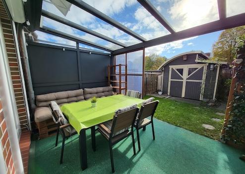 Zum Haus gehören ein Carport und ein auf Süden ausgerichteter Garten samt Gartenhaus. Hier lässt es sich im Sommer gemütlich entspannen. Sollte das Wetter ungemütlicher werden, bietet die mit Glas überdachte Terrasse Schutz (wurde 2020 nachgerüstet).
