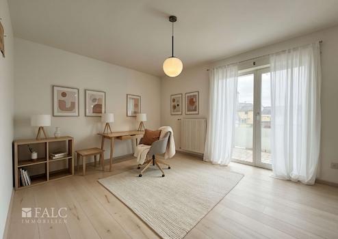 Das Schlafzimmer ist geräumig und bietet genügend Platz für ein großes Bett und einen Kleiderschrank. Die großen Fenster sorgen auch hier für eine angenehme Helligkeit. Das angrenzende Arbeitszimmer kann flexibel genutzt werden, sei es als Homeoffice oder als zusätzliches Gästezimmer.