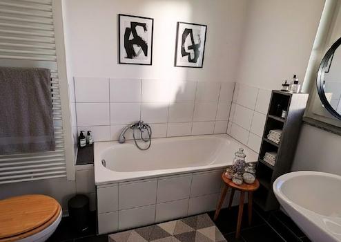 Das angrenzende Badezimmer ist weiß gefliest, mit hochwertigen Sanitärobjekten und einem Handtuchheizkörper ausgestattet. In der Badewanne lässt es sich hervorragend vom stressigen Alltag entspannen.