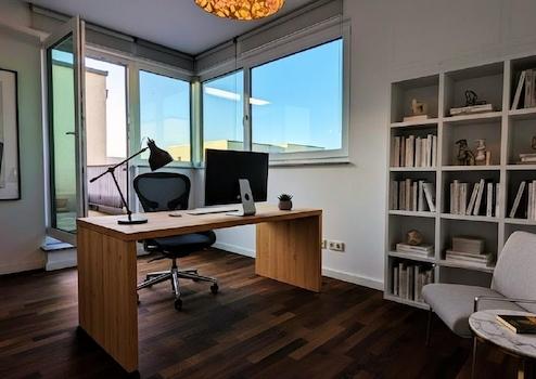 Angrenzend an das offene Wohn- und Esszimmer befindet sich ein weiterer Wohnbereich mit direktem Zugang zur Dachterrasse und großen Fenstern. Alle Fenster verfügen über eine Sonnenschutzverglasung.