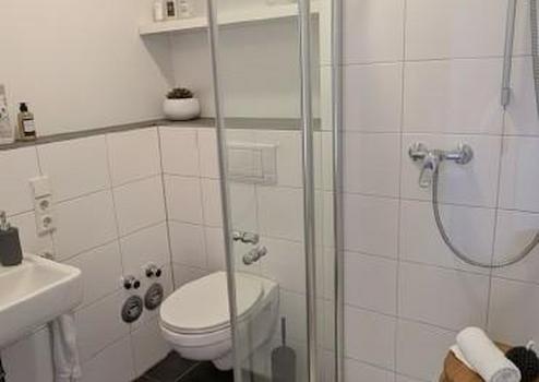 Die Wohnung hat neben dem Masterbad noch ein weiteres Badezimmer, ebenfalls ausgestattet mit einem Handtuchheizkörper. Die Lage befindet sich im Eingangsbereich der Wohnung und kann idealerweise als Gäste-WC genutzt werden. Neben Waschbecken und WC verfügt dieses Bad noch über eine bodentiefe, geräumige Dusche mit Glaswänden.