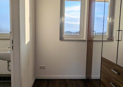 Vom Wohn- und Esszimmer hat man direkten Zugang zum Schlafzimmer. Durch die großen bodentiefen Schiebetüren des Schlafzimmers kann man ebenso die Dachterrasse betreten. Hinter dem Schlafzimmer befindet sich ein Durchgangszimmer, welches sich hervorragend als Ankleidezimmer nutzen lässt. Der vorhandene Einbauschrank verbleibt in der Wohnung.
