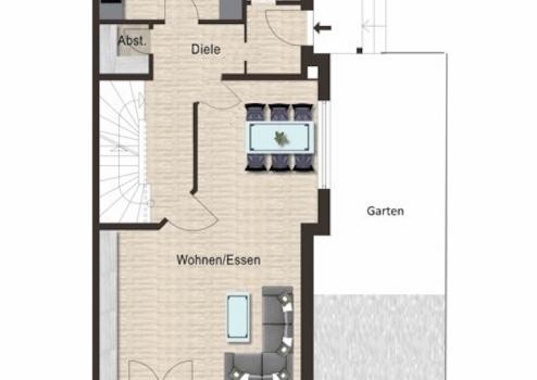 Im Erdgeschoss befindet sich der geräumige Wohn-Essbereich mit Zugang zur sonnigen Terrasse und die abgeschlossene Küche, die mit einer ansprechenden Einbauküche ausgestattet ist. Auf dieser Ebene haben Sie noch eine Gäste-Toilette mit Fenster, die zusätzlich mit einem Pissoir und einem Handwaschbecken ausgestattet ist, einen schönen Garderobenbereich und einen praktischen Abstellraum.
