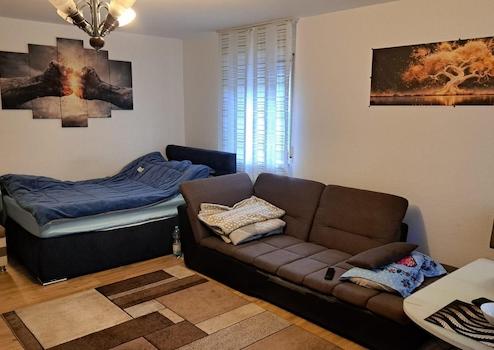 Die Wohnung verfügt über einen Wohn- und Schlafbereich und eine separate Küche. Das Badezimmer ist mit einer Badewanne, WC und Waschbecken ausgestattet.