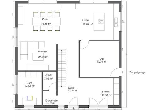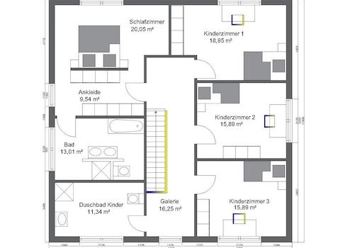 Im Erdgeschoss bildet der offen gestaltete Wohn-, Ess- und Kochbereich mit 61 m² das Herzstück des Hauses. Der gesamte Wohnbereich wird von drei Seiten mit Tageslicht durchflutet. Die Küche ist über Eck angeordnet, so kann sie nicht direkt vom Flur oder vom Wohnbereich aus eingesehen werden. Weiterhin befinden sich ein optionales Duschbad, ein Haustechnik-/Hauswirtschaftsraum, eine schöne Diele sowie ein praktisches Zusatzzimmer (Gäste/Hobby/Schlafen/Kind) im Erdgeschoss. Der Grundriss ist so konzipiert, dass auch bei Krankheit oder im Alter das Wohnen auf einer Etage möglich ist. Das Obergeschoss ist mit drei Kinderzimmern und einem Kinderbad geplant. Der Elternbereich überzeugt mit einem Ankleidebereich und einem Bad en Suite. Der Flurbereich ist als Galerie ausgestaltet.