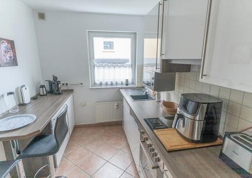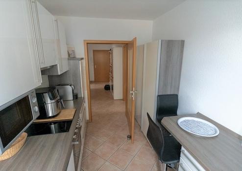 Direkt neben dem Wohn-/ Esszimmer liegt die Küche. Zudem stehen zwei gut geschnittene Schlafzimmer, ein modern gefliestes Tageslichtbad mit Badewanne und Dusche sowie ein innenliegendes Gäste-WC zur Verfügung.