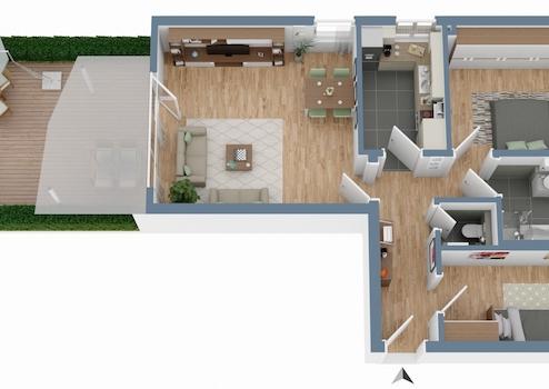 82 m² große Erdgeschosswohnung mit großer Terrasse, Tageslichtbad, G-WC und Tiefgaragenstellplatz