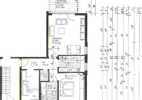 Herzstück der Wohnung ist das ca. 27 m² große Wohn-/ und Esszimmer mit direktem Zugang zur großzügigen, teilüberdachten Terrasse mit Süd-Ost- Ausrichtung.