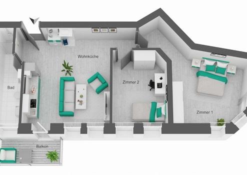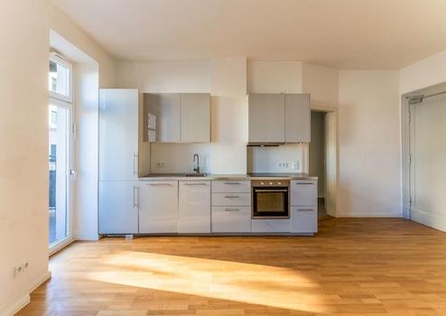 Bereits beim Betreten der Wohnung empfängt Sie ein lichtdurchflutetes, offen gestaltetes Wohnzimmer, das mit seiner Großzügigkeit den zentralen Lebensmittelpunkt bildet. Angrenzend befindet sich die moderne, voll ausgestattete Einbauküche, die höchsten Ansprüchen gerecht wird. Von hier aus genießen Sie direkten Zugang zum Ost-Balkon – ein idealer Ort, um den Feierabend entspannt im Freien ausklingen zu lassen.