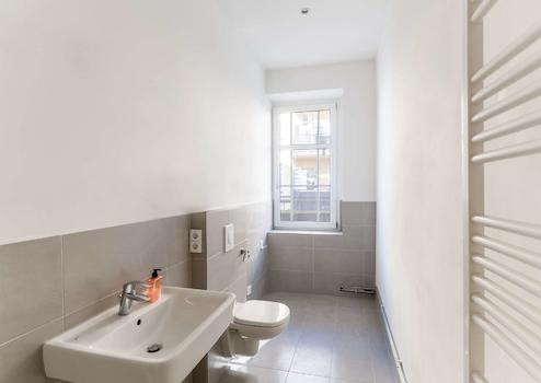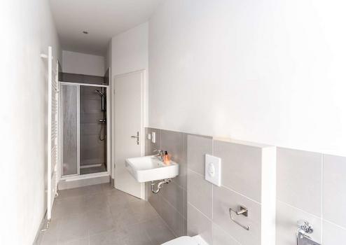 Die Wohnung verfügt über zwei geräumige Schlafzimmer. Das hochwertig sanierte Badezimmer bietet sowohl eine Dusche als auch ein WC, ein Waschbecken sowie einen Anschluss für die Waschmaschine.