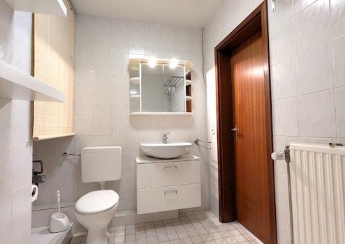 Das innenliegende, hell geflieste Duschbad präsentiert sich gepflegt und funktional.