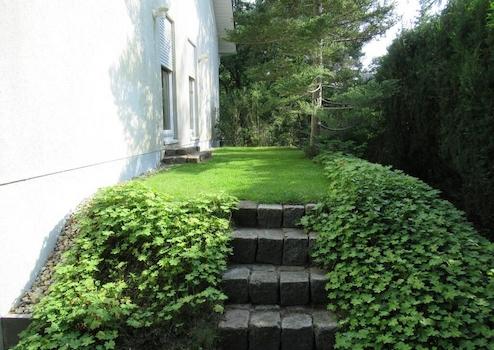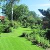* Garten mit vielen Bäumen, Sträuchen, Stauden und großen Rasenflächen zum Erholen und Spielen