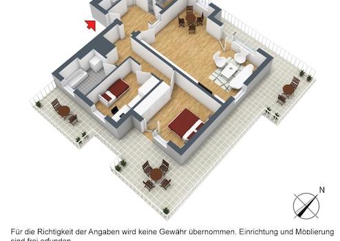 Das Penthouse liegt in der 3. Etage (47 Stufen) eines Mehrfamilienhauses im Stadtzentrum, aber ruhig. Das Treppenhaus hat eine durchgehende Glasfront, ist dadurch sehr hell und gepflegt. Die Wohnung wird von einer riesigen Dachterrasse (60 m²) an 3 Seiten umgeben, so dass Sie immer zwischen Sonne und Schatten wählen können. Das 38 m² große Wohn- Esszimmer mit Zugang zur Dachterrasse liegt Richtung Nordosten. Hier können Sie morgens die ersten Sonnenstrahlen genießen. Durch die vielen Fenster wirkt der Raum noch größer und heller. Die lange Wandseite bietet Ihnen die Möglichkeit, eine große Schrankwand zu stellen.
