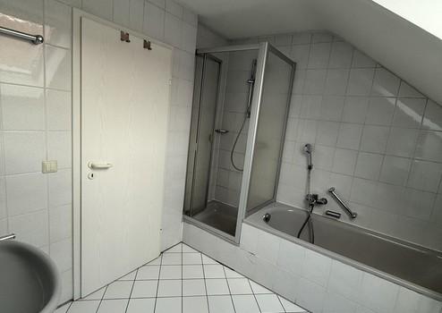 Das Badezimmer ist mit Badewanne, Dusche und WC ausgestattet. Durch das Tageslicht entsteht eine angenehme und helle Atmosphäre.