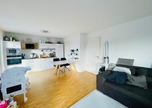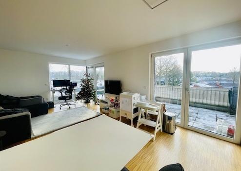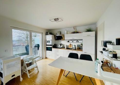 Das großzügige und helle Wohn- Esszimmer verfügt über bodentiefe Fensterflächen, eine offene Küche (die abgebildete Einbauküche ist Eigentum des derzeitigen Mieters und kann bei Bedarf übernommen werden - Preis VHS) mit angrenzendem Abstellraum und Ausgang auf die sonnige Dachterrasse mit Süd-West-Ausrichtung und Blick ins Grüne.