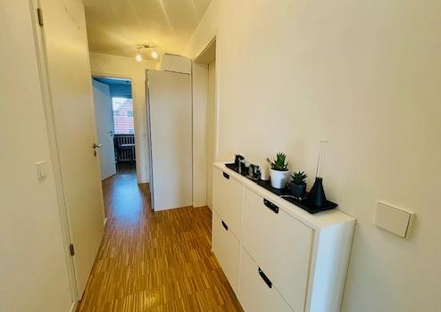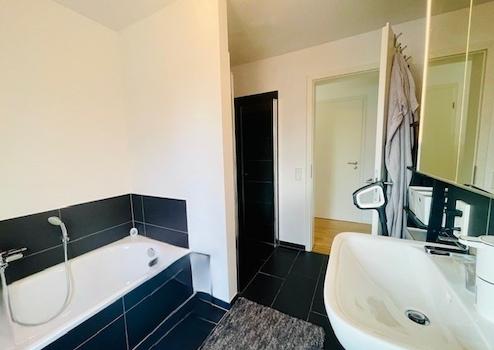 Die Wohnfläche beträgt 76 m² und teilt sich wie folgt auf: Eingangsbereich und Flur, ein großes Schlafzimmer, mit Ankleidebereich oder Platz für einen Arbeitsbereich, ein anthrazit gefliestes Tageslichtbad mit Badewanne, Dusche, Waschtisch und WC sowie ein Gäste-WC, ebenfalls mit dunkler Bodenfliese. Die Bäder sind jeweils mit weißen, hochwertigen Elementen ausgestattet.