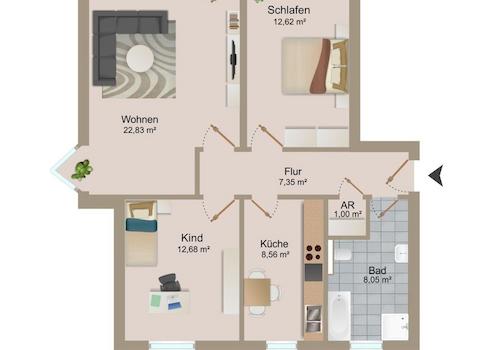 Mit einer Wohnfläche von ca. 75 Quadratmetern bietet die Wohnung vielseitige Nutzungsmöglichkeiten für Paare, kleine Familien oder Singles.